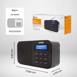 DAB digital Radio / UKW Radio mit zwei Weckzeiten Denver DAB 42 Dieses schicke DAB(+) Radio der Marke Denver bietet neben dem Empfang von UKW Radiosendern auch die Möglichkeit digitale Radiosender zu empfangen. Somit genießen Sie Ihr Lieblingsradioprogramm in bester digitaler Qualität und sind für den neuen Standard bestens gerüstet. Durch den automatischen Sendersuchlauf für alle bei Ihnen empfangbaren digitalen Radioprogrammen sowie der Möglichkeit der Speicherung von je 10 Sendern (analog und digital) ist das Denver DAB 42 sehr anwenderfreundlich gestaltet.Hauptmerkmale:DAB(+) Radio zum Empfang von digitalen RadiosendernLCD Display mit HintergrundbeleuchtungPLL-RDS-UKW Tuner zum Empfang von analogen RadiosendernTeleskopstabantenneNetz- und Batteriebetrieb möglichInklusive NetzteilBatteriebetrieb mit 4 x 1,5 V AA Batterien (nicht im Lieferumfang)Abmessungen (BxHxT): : 5 x 18 x 9,5 cmWeitere Produktmerkmale: Den eingebauten Lautsprecher auf der Gerätevorderseite können Sie mit dem elektronischen Lautstärkeregler auf der Vorderseite des Geräts einstellen. Auf der Gehäuserückseite sind der Netzsteckeranschluss sowie das Batteriefach angebracht. Mit dem kompakten Gerät können Sie nicht nur Ihr Lieblingsradioprogramm hören, Sie haben zudem die Möglichkeit das Denver DAB 42 als Wecker zu nutzen. Über die Bedientasten lässt sich die Weckzeit einstellen. DAB(+) Radio zum Empfang von digitalen RadiosendernPLL-RDS-UKW Tuner zum Empfang von analogen RadiosendernTeleskopstabantenneNetz- und Batteriebetrieb möglich Abmessungen (BxHxT): : 225 x 153 x 75 mm Entdecken Sie die Welt der DigitalradiosDas DAB-42 von Denver ist ein kompaktes und elegantes Digitalradio im schwarzen oder weißen Aluminium-Look.Egal ob in der Küche, im Wohnzimmer, im Schlafzimmer oder Ihrem Büro in der Arbeit, das Radio macht immer eine gute Figur und passt zu jeder Einrichtung.Mit dem eingebauten DAB+ Digitalradio und FM Radio können Sie all Ihre Lieblingssender einfach empfangen. Dabei sind 10 voreingestellte DAB+ bzw. FM Kanäle vorhanden.Über die Radio-Funktionen hinaus ist ein Dual Alarm System integriert, mit dem Sie sowohl per Klingelton als auch per Radiosender Ihrer Wahl aufgeweckt werden können.Für eine übersichtliche Darstellung der aktuellen Titel oder Sender ist ein LCD-Display verbaut, mit dem Sie in Kombination mit der komfortablen Tastensteuerung die Funktionen des Radios spielend einfach nutzen können.Um ungestört Radio mit Ihrem Kopfhörer genießen zu können ist zudem ein 3,5mm-Ausgang vorhanden.Produktmerkmale:DAB+ und FM-Radio 10 voreingestellte Kanäle für DAB+/UKW1 x 1 Watt LautstärkeausgabeLCD-Display mit HintergrundbeleuchtungDoppelte WeckfunktionTeleskopantenne und 3,5 mm KopfhöreranschlussKann mit dem mitgelieferten Adapter oder vier AA-Batterien verwendet werden (Batterien nicht enthalten)Abmessung: 17,80 x 9,20 x 4,80 cm Anschlüsse und SchnittstellenKopfhörer-Anschluss3,5 mmKopfhörerausgänge1AudioRMS-Leistung1 WBatterieAnzahl unterstützter Akkus/Batterien4Kompatible Akku-/BatteriegrößenAABildschirmDisplay-TypLCDEingebautes DisplayJaEnergieAC Eingangsfrequenz50 HzAC Eingangsspannung230 VEnergiequelleWechselstrom/BatterieFunktionenAkustische SignaleJaAntennentypExternAnzahl Alarme2Playback MP3NeinProduktfarbeSchwarzProjektionNeinThermometerNeinGewicht & AbmessungenBreite48 mmGewicht510 gHöhe95 mmTiefe178 mmLautsprecherAnzahl eingebauter Lautsprecher1Eingebaute LautsprecherJaRadioRadiotypTragbarTunertypDigitalUnterstützte BänderDAB+, FMVerpackungsinformationVerpackungsbreite70 mmVerpackungshöhe100 mmVerpackungstiefe250 mmWeitere SpezifikationenApple-Docking-KompatibilitätNicht unterstütztDocking-Station enthaltenNeinWecktöneJaKontaktinformationen des HerstellersEingetragener Handelsname oder Handelsmarke des HerstellersDenver A/SPostanschriftOmega 5A, Soeften, DK-8382 Hinnerup,