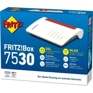 Highspeed-VDSL an allen Anschlüssen Die FRITZ!Box 7530 Edition International bringt das High-Speed-Heimnetz an jeden DSL-Anschluss und wird mit einer Fülle an Extras höchsten Ansprüchen gerecht. Die FRITZ!Box unterstützt mit VDSL-Supervectoring 35b den neuen Standard für Übertragungsleistungen von bis zu 300 MBit/s. Damit verdreifacht sich die Geschwindigkeit am DSL-Anschluss und Downloads riesiger Datenpakete erfolgen in Rekordgeschwindigkeit. High-End-WLAN AC+N mit Mesh-Komfort Die FRITZ!Box 7530 Edition International ist mit ihrer innovativen WLAN-Ausstattung ideal für ein Heimnetz mit hoher Anzahl an WLAN-Geräten geeignet. Die FRITZ!Box funkt dank Dual-WLAN parallel in den Frequenzbändern 2,4 GHz (WLAN N) und 5 GHz (WLAN AC), wodurch faktisch zwei WLAN-Netze bereitgestellt und in Summe Datenraten von bis zu 1.266 MBit/s erzielt werden können. Breitbandintensive Anwendungen werden so im Parallelbetrieb und auf mehreren WLAN-Geräten nutzbar – ohne Einbußen bei Geschwindigkeit und Stabilität. Im Zusammenspiel mit Produkten aus den Serien FRITZ!WLAN Repeater und FRITZ!Powerline (mit WLAN-Funktion) lässt sich ein leistungsstarkes und flexibles Mesh-WLAN aufbauen: Die um die FRITZ!Box in der Wohnung verteilten Companion Devices werden automatisch zu einem einzigen intelligenten Funknetz zusammengelegt. So wird das gesamte WLAN optimal ausgenutzt und hat praktischerweise nur noch einen Namen und ein Passwort. Telefonie-Optionen für jeden Anspruch An der integrierten VoIP-Telefonanlage können ein Analog-Telefon sowie bis zu sechs DECT-Schnurlostelefone (z. B. FRITZ!Fon) angemeldet werden. Per WLAN werden auch Smartphones zum vollwertigen VoIP-Telefon. Mehrere integrierte Anrufbeantworter, lokale und Online-Telefonbücher sowie zahlreiche Komfortfunktionen vervollständigen das breite Telefonie der FRITZ!Box 7530 Edition International. Über die DECT-Basisstation können auch Smarthome-Geräte, wie die schaltbaren Steckdosen FRITZ!DECT 200 und 210 sowie der Heizkörperregler FRITZ!DECT 301 gesteuert werden. Vielseitige Multimedia-Funktionen Die FRITZ!Box bringt angeschlossene USB-Speicher sowie Online-Speicher und darauf abgelegte Inhalte ins Heimnetz. Dank integriertem Mediaserver mit NAS-Anbindung werden gespeicherte Filme, Musik und Bilder verfügbar gemacht und können z. B. mittels Tablet oder Smartphone an Wiedergabegeräte verteilt werden. Die FRITZ!Box 7530 Edition International bildet damit eine leistungsfähige Plattform für vernetzte Multimedia-Anwendungen wie IPTV, Video on Demand oder Streaming. Dabei bleibt die FRITZ!Box 7530 Edition International dank mehrerer Eco-Mode-Automatismen stets sehr sparsam im Verbrauch ( 6 Watt).WLAN-Router für VDSL und ADSL, Routerbetrieb auch mit Kabelmodem, bis zu 300 MBit/s, voreingestellte Firewall, WLAN AC + N, WLAN-Verschlüsselung nach WPA2-Standard, VoIP Telefonanlage, bisz u 6 Schnurlos-Telefone, einfache deutschsprachige Benutzeroberfläche, USB-Anschluss, 4 LAN-Anschlüsse, 1 analoger Telefon-Anschluss.HighlightsGeeignet für alle IP-basierten Anschlüsse (ADSL und VDSL)Internet-Geschwindigkeit von bis zu 300 MBit/s durch VDSL-Supervectoring 35bSichere Internetnutzung durch voreingestellte FirewallMehr Performance, Flexibilität und stabilste Verbindungen durch gleichzeitiges WLAN AC + N (Dualband)VoIP-Telefonanlage mit vielseitigen Komfortfunktionen für Analog-, DECT- und IP-Telefone)DECT-Basis für bis zu 6 Schnurlos-Telefone (z. B. alle FRITZ!Fon Modelle) sowie für schaltbare Steckdosen und Heizkörperregler FRITZ!DECTAnalog-Telefon, -Fax, -Anrufbeantworter, -Türsprechanlage anschließbar1 leistungsstarker USB-Anschluss für Speichermedien (NAS), Netzwerkdrucker und Mobilfunksticks4 ultraschnelle Gigabit-LAN-Anschlüsse für Computer, Fernseher und andere Netzwerk-Geräte, 1 analoger Telefon-Anschluss Highspeed-VDSL an allen Anschlüssen. Die FRITZ!Box 7530 bringt das High-Speed-Heimnetz an jeden DSL-Anschluss und wird mit einer Fülle an Extras höchsten Ansprüchen gerecht. Die FRITZ!Box unterstützt