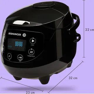Top-Feature Top-Features , Timer- und Warmhaltefunktion, Premium Innentopf mit doppelter Keramikbeschichtung, Messbecher, Reislöffel, 7-Kochphasen-Technologie, 8 Kochprogramme, LED-Display, Tragegriff, Allgemein Weitere Vorteile , Super leicht zu reinigen Modernes, hochwertiges Design Große Farbauswahl Intuitive Bedienung durch einfache Menüführung und LED-Display Für jeden Reis der perfekte Kochmodus Gemüse, Fisch und Fleisch einfach mitgaren Kein verbrannter Reis mehr, Handhabung & Komfort Art Bedienung , Drucktasten, Displaytechnologie , LED-Display, Eigenschaften Kocheinsatz , Herausnehmbar Antihaftbeschichtet Keramikbeschichtung Füllmengenmarkierung, Eigenschaften Deckel , Sicherheitsverschluss Deckel mit Scharnier Dampfventil, Kabelaufbewahrung , Kabel abnehmbar, Farbe & Material Farbe , Schwarz, Material Gehäuse , Kunststoff, Material Deckel , Kunststoff, Material Kocheinsatz , 1. Beständige zweifache Antihaftbeschichtung aus Keramik 2. 2.0mm dicke Aluminiumlegierung 3. Hitzebeständige Außenschale aus Bronze, Materialeigenschaften , Doppelte Antihaftbeschichtung aus Keramik, Maße & Gewicht Höhe , 22 cm, Breite , 21 cm, Tiefe , 26 cm, Gewicht , 2.87 kg, Technische Daten Leistung , 350 W, Spannung , 220 V, Dauer Warmhaltefunktion maximal , 24,00 Std., WEEE-Reg.-Nr. DE , 75303935, Programme & Funktionen Funktionen , Timerfunktion, Automatischer Übergang in Warmhaltefunktion (bis zu 24h), Backfunktion, 8 Kochprogramme, Dampfgarfunktion, Zubereitungsmöglichkeiten , Reis Quinoa Getreide Gemüse Fisch Fleisch, Zeitfunktionen , Timerfunktion, Kontrollleuchten , Kochanzeige Warmhalteanzeige, Ausstattung Ausstattung , Tragegriff Premium Innentopf mit doppelter Keramikbeschichtung Messbecher LED-Display Sicherheitsverschluss 8 Kochprogramme 7-Kochphasen-Technologie Dämpfeinsatz, Mitgeliefertes Zubehör , Dämpfeinsatz Reislöffel Messbecher, Verarbeitungsmengen Fassungsvermögen , 0.6 l, Verarbeitungsmenge Reis , 300,00 g, Reinigung & Pflege Pflegehinweise , Der Digitale Reishunger Reiskocher ist auf eine lange Lebensdauer ausgelegt. Damit du wirklich lange etwas von ihm hast, solltest du jedoch ein paar Hinweise zur Pflege und Instandhaltung beachten. • Entferne nach der Nutzung unbedingt alle zurückgebliebenen Essensreste und reinige den Digitalen Reishunger Reiskocher direkt. • Verzichte bei der Reinigung auf Metallbürsten, Kratzbürsten oder starke Chemikalien – die schaden eher, als dass sie nutzen. Sollten sich Überreste nicht direkt entfernen lassen, weiche den Innentopf mit Wasser und etwas Geschirrspülmittel ein, bevor du ihn nochmal reinigst. • Auf keinen Fall den Reiskocher unter Wasser halten! Für das Außengehäuse benutzt du am besten einen feuchten Schwamm oder einen weichen Putzlappen. • Den inneren Deckel kannst du herausnehmen. Dazu einfach die Entsperr-Riegel drücken und den Deckel aus der Halterung heben. Den Deckel solltest du nach jeder Nutzung mit einem Schwamm in Seifenwasser reinigen. • Stelle den Topf und den inneren Deckel niemals in die Spülmaschine. Der Waschgang und die Chemikalien sind dafür zu aggressiv. Alle Schäden, die von einem Geschirrspüler verursacht werden, werden nicht von unserer Garantie abgedeckt. • Die Dampfkappe auf dem Deckel kannst du herausnehmen. Auch sie sollte regelmäßig gesäubert werden. • Benutze ausschließlich Kochutensilien aus Kunststoff oder Holz. Metallbesteck kann die Keramikbeschichtung im Innentopf beschädigen. • Entferne und reinige den Kondenswasser-Auffangbehälter nach jeder Nutzung. Wasche ihn, lass ihn trocknen und bringe ihn anschließend wieder an seinem Platz an. • Niemals den Innentopf mit Essig reinigen. Auch hier leidet die Keramikbeschichtung. • Mit der Zeit kann sich die Farbe der Keramikbeschichtung ändern. Das ist absolut normal und kein Grund zur Sorge., Wissenswertes Herstellungsland , China,