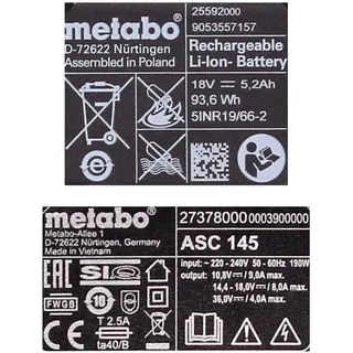 Metabo Basis-Set, 18 V, 5,2 Ah 3 x Akkupack 18 V / 5.2 Ah 1 x Ladegerät ASC 30-36 V Eigenschaften:3 x Li-Power Akkupack 18 V/5,2 AhSchnellladegerät ASC 145 Metabo Elektrowerkzeuge halten besonders lang. Technische Daten: Akkuspannung: 18 VAkkukapazität: 5,2 AhAnzahl Akkus: 3 Bitte beachten Sie: Dekoration nicht im Lieferumfang enthalten. Technische Daten: Akkuspannung: 18 VAkkukapazität: 5,2 AhAnzahl Akkus: 3 Bitte beachten Sie: Dekoration nicht im Lieferumfang enthalten. Technische Daten: Akkuspannung: 18 VAkkukapazität: 5,2 AhAnzahl Akkus: 3 Bitte beachten Sie: Dekoration nicht im Lieferumfang enthalten. Technische Daten: Akkuspannung: 18 VAkkukapazität: 5,2 AhAnzahl Akkus: 3 Bitte beachten Sie: Dekoration nicht im Lieferumfang enthalten. Technische Daten: Akkuspannung: 18 VAkkukapazität: 5,2 AhAnzahl Akkus: 3 Bitte beachten Sie: Dekoration nicht im Lieferumfang enthalten. Technische Daten: Akkuspannung: 18 VAkkukapazität: 5,2 AhAnzahl Akkus: 3 Bitte beachten Sie: Dekoration nicht im Lieferumfang enthalten. Technische Daten: Akkuspannung: 18 VAkkukapazität: 5,2 AhAnzahl Akkus: 3 Bitte beachten Sie: Dekoration nicht im Lieferumfang enthalten. Technische Daten: Akkuspannung: 18 VAkkukapazität: 5,2 AhAnzahl Akkus: 3 Bitte beachten Sie: Dekoration nicht im Lieferumfang enthalten. Technische Daten: Akkuspannung: 18 VAkkukapazität: 5,2 AhAnzahl Akkus: 3 Bitte beachten Sie: Dekoration nicht im Lieferumfang enthalten. Technische Daten: Akkuspannung: 18 VAkkukapazität: 5,2 AhAnzahl Akkus: 3 Bitte beachten Sie: Dekoration nicht im Lieferumfang enthalten. Technische Daten: Akkuspannung: Bitte beachten Sie: Dekoration nicht im Lieferumfang enthalten. Technische Daten:Akkuspannung: 18 VAkkukapazität: 5,2 AhAnzahl Akkus: 3 Bitte beachte: Dekoration nicht im Lieferumfang enthalten. Lieferumfang: - 3x Metabo Li-Power Akkupack 5,2 Ah ( 625592000 ) - 1x Metabo Ladegerät ASC 145 ( 627378000 ) Produktbeschreibung: Die Akkupacks bestechen durch ein höchst effizientes und schonendes Laden, eine optimale Ausnutzung der Energie sowie eine extrem lange Lebensdauer. Die Metabo Ultra-M-Technologie steht für die optimale Abstimmung und perfekte Kommunikation zwischen Maschinen-Motor, Akkupacks und Ladegerät. Ein multifunktionales Überwachungssystem erfasst laufend sowohl die Akkutemperatur als auch die Stromstärke, ebenso sorgt die elektronische Einzelzellenüberwachung (ESCP) für eine lange Lebensdauer der Akkus. Die Kapazitätsanzeige ermöglicht die permanente Kontrolle des Füllzustands. Die Akkupacks können lange gelagert werden bei nahezu keiner Selbstentladung. Ein wichtiger Vorteil für Anwender ist die grenzenlose Kompatibilität. Seit 2009 passen Akkupacks jeder Generation zu allen Metabo Akkumaschinen entsprechender Voltklasse und jedes Metabo Ladegerät lädt alle Akkupacks der entsprechenden Baugröße. Mit den Metabo Akkupacks ist man so auch in Zukunft auf der sicheren Seite. Das Ladegerät ist zum Aufladen aller Li-Ion und LiHD Schiebesitz-Akkupacks (12V-36V) mit angepasstem Akku-Ladestrom von Metabo geeignet. Das ASC 145 besticht durch eine sehr geringe Stand-by Aufnahmeleistung. Ein intelligentes prozessorgesteuertes Lademanagement sichert das schonende Laden und maximale Anzahl der Ladezyklen. Die 100% Kompatibilität zu allen 18 V-Maschinen, Akkus und Ladegeräten der CAS (Cordless Alliance System) Partner: Rothenberger, Edding, Fischer, Mafell, Collomix, Eibenstock, Eisenblättert, Haaga, Starmix, Steine, Rokamat, Birchmeier macht die drei Akkupacks und das Ladegerät zu drei Akkupacks und einem Ladegerät für alles. Technische Daten: Herstellernummer: 625592000 Spannung: 18 V Akkukapazität: 5,2 Ah Arbeit/Energie: 93,6 Wh Kompatibilität: CAS (Cordless Alliance System) Partner Herstellernummer: 627378000 Netzspannung: 230-240 V Netzfrequenz: 50-60 Hz Max. Ladestrom: 8 A Kompatibilität: CAS (Cordless Alliance System) Partner Bei gewerblicher Nutzung beachten Sie bitte die Bauvorschriften! Metabo Basis-Set 3 x 5.2 AhDas Metabo Basis-Set besteht aus h
