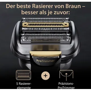 Der Braun Series 9 Pro+ Elektrorasierer definiert die Rasur neu – für eine gründliche Rasur mit ultimativem Hautkomfort. Mit 5 speziellen ProShave-Elementen inklusive ProLift-Klinge. Der Series 9 Pro+ sorgt für eine effiziente und sanfte Rasur in jedem Zug, egal ob Sie einen 1-, 3- oder 7-Tage-Bart haben. Erleben Sie die ultimative Präzision dank ProTrimmer mit Klingen aus Chirurgenstahl, der selbst längere Haare, Koteletten und Schnurrbart effektiv erfasst. Für Trocken- und Nassrasur geeignet. Mit Premium-Zubehör: Braun 6-in-1-Reinigungsstation für einen Rasierer , jeden Tag – auf Knopfdruck.Im Lieferumfang enthalten:1x Elektrorasierer1x 6-in-1-Reinigungsstation mit Reinigungskartusche1x Reise-Etui1x Ladekabel1x ReinigungsbürsteDie Produktvorteile von Braun Elektrischer Rasierer - Series 9 - 9560cc System - Black: Egal, ob 1-, 3- oder 7-Tage-Bart: 5 perfekt synchronisierte Rasierelemente sorgen für außergewöhnliche Effizienz und Hautkomfort in jedem Zug, selbst bei langen und schwierigen HaarenUltimative Präzision, selbst bei schwierigen Haaren: Der integrierte Precision ProTrimmer mit Klingen aus Chirurgenstahl sorgt für maximale Effizienz beim Trimmen von Schnurrbart, Koteletten sowie Härchen unter der Nase 100% wasserdicht. Mit einem leistungsstarken Li-Ionen-Akku mit 60 Minuten Laufzeit. Für Trocken- und Nassrasur geeignetFür einen Rasierer , jeden Tag: Die 6-in-1-Reinigungsstation reinigt, trocknet und lädt Ihren Rasierer auf Der Braun Series 9 PRO+ Elektrorasierer bietet dank seiner 5 ProShave-Elemente, einschließlich der ProLift-Klinge, eine effiziente und sanfte Rasur bei jedem Zug. Es eignet sich für 1-, 3- oder 7-Tage-Bärte und ist wasserfest. Dieser kabellose Elektrorasierer hat eine Akkulaufzeit von 60 Minuten und kann trocken verwendet werden. * Hauptfarbe: Schwarz * Marke: BRAUN * Zielgruppe: Erwachsener * Geschlecht: Gemischt Braun Series 9 Pro+ 9560cc Wet&Dry Mit SyncroSonicTM Technologie und Titanium-beschichtetem Mitteltrimmer. In einer Stunde vollständig geladen. Bis zu 60 Minuten kabelloses Rasieren. Der hochwertige Li-Ionen Akku liefert zuverlässig Leistung. SmartCare Center 6 in 1 Station. Spezifikationen: Farbe: SchwarzFirmensitz Braun: Braun GmbH. Frankfurter Str.comEAN: 7500435218214Wet&Dry: JAScherfolie/Scherköpfe: JAGeeignet für: Für ihrBartschneider: JASchnellladung (1 Rasur): 5 min.Akkulaufzeit bis zu: 60 min.Abwaschbar: JAClean&Charge: JALadezeit: 60 min Im Lieferumfang enthalten: Braun Series 9 Pro+ Rasierer HerrenElektrorasierer mit 5 Pro Rasierelementen& Präzisions-Langhaarschneider ProTrimmer Reinigungsstation& 60 Min LaufzeitWet & DryGeschenk MannSchwarz ProdukttypFolienrasiererAllgemeine InformationenSerienBraun Series 9, Braun Series 9 ProFarbeschwarzScherköpfebeweglich, flexibelAnzahl Klingen/Scherköpfe5LieferumfangReinigungsstation, Ladekabel, Reinigungspinsel, Etui, ReinigungskartuscheLeistungDarauf solltest du achtenabwaschbar, Trockenrasur, Nassrasur, mit TrimmerTechnische DatenStromversorgungLithium-Ionen Akku, AkkuBetriebszeit60 Min.AnzeigeLED Typ: RasiererFarbe: SchwarzEigenschaften: WasserdichtAkku-AnzeigeKabellosEingebautes DisplayNass und trockenAkku-Typ EingebautLithium-IonenStromquelle: BatterieLebensdauer der Batterie: ca. 1 StundeEnthält: ReisetascheBürsteLadegerätWiederaufladbar: JaKlingen: 5Enthält: Benutzerhandbuch Trimmer:JaZahl der Rasierapparatköpfe/-klingen:5Produktfarbe:SchwarzEingebautes Display:JaPräzisionstrimmer:JaWasserfest:JaNass & Trocken:JaSonic-Technologie:JaBatteriestandsanzeige:JaEnergiequelle:AkkuWiederaufladbar:JaAkku-/Batterietechnologie:Lithium-Ion (Li-Ion)Akku-/Batterietyp:Integrierte BatterieBetriebsdauer:60 minDrahtlos:JaVerpackungsart:BoxMenge pro Packung:1 Stück(e)Reinigungskartusche:JaBasisstation:JaFunktionen der Rasierer-Basisstation:Ladend, Reinigung, TrocknenLadegerät:JaReinigungsbürste:JaBetriebsanleitung:JaTransporttasche:Ja Hauptmerkmale Leistungen Trimmer Ja Zahl der Rasierapparatköpfe/-klingen 5 Präzisionstrimm