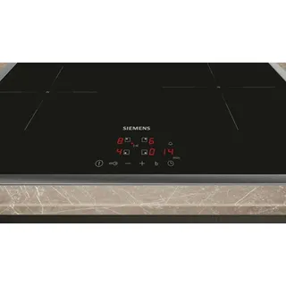60 cm: Platz für 4 Töpfe oder PfannenFlexibilität der KochzonenBräterzone: Extra zuschaltbare Kochzone für großes BratgeschirrKochzone vorne links: 180 mm, 1.8 kW (maximale Leistung 3.1 kW)Kochzone hinten links: 180 mm, 280 mm, 1.8 kW (maximale Leistung 3.1 kW)Kochzone hinten rechts: 145 mm, 1.4 kW (maximale Leistung 2.2 kW)Kochzone vorne rechts: 210 mm, 2.2 kW (maximale Leistung 3.7 kW)BenutzerfreundlichkeittouchControl Bedienung: Steuerung der Leistung über +/- Touch-Tasten.17 Leistungsstufen: Stelle die Hitze mit 17 Leistungsstufen (9 Hauptstufen und 8 Zwischenstufen) präzise ein.Timer mit Abschaltfunktion: Schaltet die Kochzone am Ende der eingestellten Zeit aus (z. B. bei gekochten Eiern).Timer: Am Ende der eingestellten Zeit ertönt ein Signal (z. B. beim Pastakochen).Zeitersparnis und EffizienzpowerBoost-Funktion für alle Kochzonen: Mit 50 % mehr Leistung z. B. Wasser schneller zum Kochen bringen als auf höchster Leistungsstufe.quickStart: Beim Einschalten wählt das Kochfeld automatisch die Kochzone aus, auf dem im ausgeschalteten Zustand Kochgeschirr platziert wurde.reStart: Im Falle von unbeabsichtigtem Ausschalten des Kochfeldes bleiben alle Einstellungen erhalten, wenn du innerhalb von 4 Sekunden wieder einschaltest.Schnelles Abschalten: Schnelles Abschalten durch längeres Berühren der Bedienfläche der Kochzone.DesignRahmen: Flachrahmen-DesignSicherheit2-stufige Restwärmeanzeige je Kochzone: Zeigt an, welche Kochzonen noch heiß oder warm sind.Kindersicherung: Verhindert eine unbeabsichtigte Aktivierung des Kochfeldes.Hauptschalter: Alle Kochzonen auf einmal ausschalten.InstallationMaße des Gerätes (HxBxT mm): 55 x 583 x 513Erforderliche Nischenmaße (HxBxT mm): 55 x 560 x (490 - 500)Minimale Arbeitsplattenstärke: 16 mmGesamtanschlusswert: 7400 WpowerManagement Funktion: Bei Bedarf die maximale Leistung begrenzen (abhängig von der Absicherung der Elektroinstallation).Netzkabel: 110 cm, Anschlusskabel beigelegt in VerpackungProduct series: iQ300Bauform: EingebautSteuerung: ElektronischBedienelemente: Touch-SteuerungEnergiequelle: ElektroLage der Steuerung: VorneHauptoberflächenmaterial: GlaskeramikFarbe Gerät: SchwarzGrundfarbe des Produkts: Nicht zutreffendRahmenausführung: RahmenRahmenfarbe: EdelstahlAnschlusswert: 7400 WSpannung: 220-240 VMindestspannung: 220 VMaximalspannung: 240 VFrequenz: 50; 60Minimalfrequenz: 50Maximalfrequenz: 60Länge Anschlusskabel: 110 cmSteckerart: Ohne Stecker (Anschluss durch Elektrofachkraft)Gerätebreite: 58,3 cmGerätehöhe: 5,5 cmGerätetiefe: 51,3 cmHöhe verpacktes Gerät: 13 cmBreite verpacktes Gerät: 75 cmTiefe verpacktes Produkt: 60 cmNischenhöhe minimal: 49 cmNischenhöhe maximal: 50 cmNischenbreite minimal: 56 cmNischenbreite maximal: 56 cmNischentiefe: 5,5 cmNettogewicht: 12,0 kgBruttogewicht: 13,2 kgFrame material: EdelstahlEnergieverbrauch des 1. Heizelements pro kg: 175.0 Wh/kgEnergieverbrauch des 3. Heizelements pro kg: 175.0 Wh/kgEnergieverbrauch des 5. Heizelements pro kg: 175.0 Wh/kgEnergieverbrauch des 7. Heizelements pro kg: 175.0 Wh/kgEnergieintelligentes Gerät, kann Verbrauchsverhalten optimieren (2017/1369/EU): NeinDrahtlose Kommunikation möglich: NeinNetzwerk-Breitbandtechnologie: Nicht zutreffendArt der Schnittstelle zur Ansteuerung: NeinMöglichkeit zum Fern-Upgrade: NeinMöglichkeit zum Remote-Update zur Wartung: NeinMöglichkeit zur Sprachsteuerung: NeinAutomatikprogramm: NeinLage der Kochzone: vorne linksLage der 2. Kochzone: mitte linksLage der 3. Kochzone: hinten linksLage der 4. Kochzone: mitte hintenLage der 5. Kochzone: hinten rechtsLage der 6. Kochzone: mitte rechtsLage der 7. Kochzone: vorne rechtsLage der 8. Kochzone: vorne mitte / zentralLage der 9. Kochzone: zentralArt der Kochzone: InduktionArt der 3. Kochzone: InduktionArt der 5. Kochzone: InduktionArt der 7. Kochzone: InduktionAbmessungen der Kochzone: 18 cmAbmessungen der 3. Kochzone: 18 cmAbmessungen der 5. Kochzone: 14,5 cmAbmessungen der 7. Kochzone: 21 cmLeistung der Kochzone: 1800.0 WLeistung der 3. K
