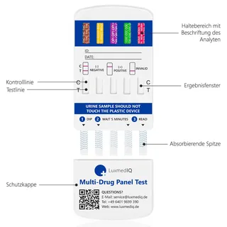 Der LuxmedIQ Drogentest Multi 10 erkennt sicher und zuverlässig 10 verschiedene Drogen im menschlichen Urin. Jede Testkassette enthält 10 Teststreifen, die jeweils auf spezifische Drogen ansprechen. Dadurch ermöglichen wir Ihnen, in einem einzigen Testvorgang ein Urin Drogenscreening auf das Vorhandensein von 10 Drogen gleichzeitig durchzuführen. Entwickelt für einfache Eigenanwendung, führt Sie die detaillierte Anleitung Schritt für Schritt durch den Testprozess. Sie können den Test ohne ärztliche Aufsicht durchführen und erhalten in nur 5 Minuten ein Ergebnis, dem Sie vertrauen können. Nachdem man eine Droge genommen hat, baut der Körper sie ab. Dabei entsteht ein Abbauprodukt, das mit dem Urin ausgeschieden wird. Diese Abbauprodukte, auch Metaboliten genannt, sind eine gute Anzeige für Drogentests. Ein solcher Test misst die Menge der Droge oder ihrer Metaboliten im Urin. Ein positives Ergebnis zeigt sich, wenn die Menge über einem bestimmten Grenzwert (Cutoff) liegt. Es ist wichtig zu wissen, wann (Minimale Erkennungszeit) und wie lange (Maximale Erkennungszeit) Drogen im Urin nachgewiesen werden können. Dies hängt von verschiedenen Faktoren ab: dem Cutoff, dem Urin-PH-Wert, der Art der Droge, wie oft und wie viel man genommen hat, und wie schnell der Körper die Stoffe abbaut. Individuelle Faktoren wie Alter, Gewicht, Gesundheit, Veranlagung usw. spielen auch eine Rolle. Droge Cutoff Level Min. Erkennungszeit Max. Erkennungszeit Amphetamin (D-Amphetamin) 1.000ng/mL 4-6 Stunden 2-3 Tage Kokain (Benzoylecgonin) 300ng/mL 2-6 Stunden 2-3 Tage Buprenorphin 10ng/mL 2-6 Stunden 2-4 Tage Methadon (2-Ethyliden-1,5-dimethyl-3,3-dipheylpyrrolidin) 300ng/mL 3-8 Stunden 1-3 Tage Cannabis (11-Nor-Δ9-THC-9-COOH) 50ng/mL 1-3 Stunden 1-7 Tage Oxazepam 300ng/mL 2-7 Stunden 1-4 Tage Oxycodon 100ng/mL 1-3 Stunden 1-2 Tage Methamphetamin 1.000ng/mL 4-6 Stunden 2-3 Tage Morphin 2.000ng/mL 2-6 Stunden 1-3 Tage Ecstasy (Methylendioxymethamphetamin) 500ng/mL 2-7 Stunden 2-3 Tage WIE TESTE ICH RICHTIG? Um Anwendungsfehler zu vermeiden, empfehlen wir vor der Testdurchführung die beiliegende Gebrauchsanweisung vollständig zu lesen. Danach lässt sich der Test sicher in 3 einfachen Schritten durchführen: Entfernen Sie die Schutzkappe und tauchen Sie die Testkassette 10 bis 15 Sekunden lang mit den absorbierenden Spitzen in die Urinprobe ein. Setzen Sie die Schutzkappe wieder auf und legen Sie den Drogentest auf eine flache Oberfläche. Warten Sie für 5 Minuten. Jetzt können Sie den Drogentest auswerten. ERGEBNIS RICHTIG ABLESEN Positiv (+) - Wenn ein Strich im Kontrollbereich (C) erscheint, aber nicht im Testbereich (T), dann ist das Ergebnis positiv für die entsprechende Droge. Negativ (-) - Wenn ein Strich im Kontrollbereich (C) und im Testbereich (T) erscheint, ist das Ergebnis negativ, für die entsprechende Droge, unabhängig davon, wie hell oder dunkel die Linien erscheinen. Ungültig - Wenn nach 5 Minuten keine Linie im Kontrollbereich (C) erscheint, dann ist das Ergebnis ungültig. WICHTIG: Jeder Teststreifen muss individuell ausgewertet werden. Jeder Strich kann in der Farbe und der Dunkelstufe variieren. Vergleichen Sie nicht die Strichfarbe oder -stärke innerhalb des gleichen Teststreifens oder zwischen verschiedenen Teststreifen. PACKUNGSINHALT 5 individuell verschweißte Testkassetten Drogentest Multi 10 Eine ausführliche bebilderte Gebrauchsanweisung auf Deutsch und Englisch
